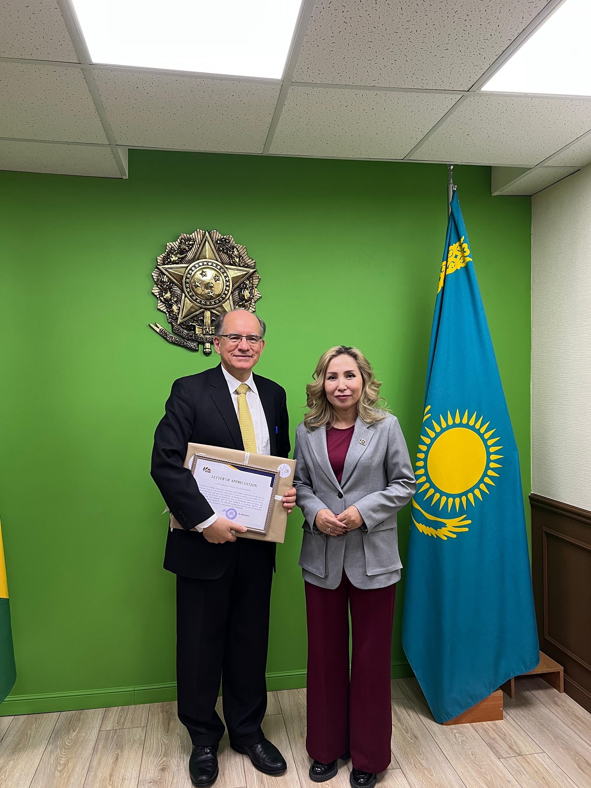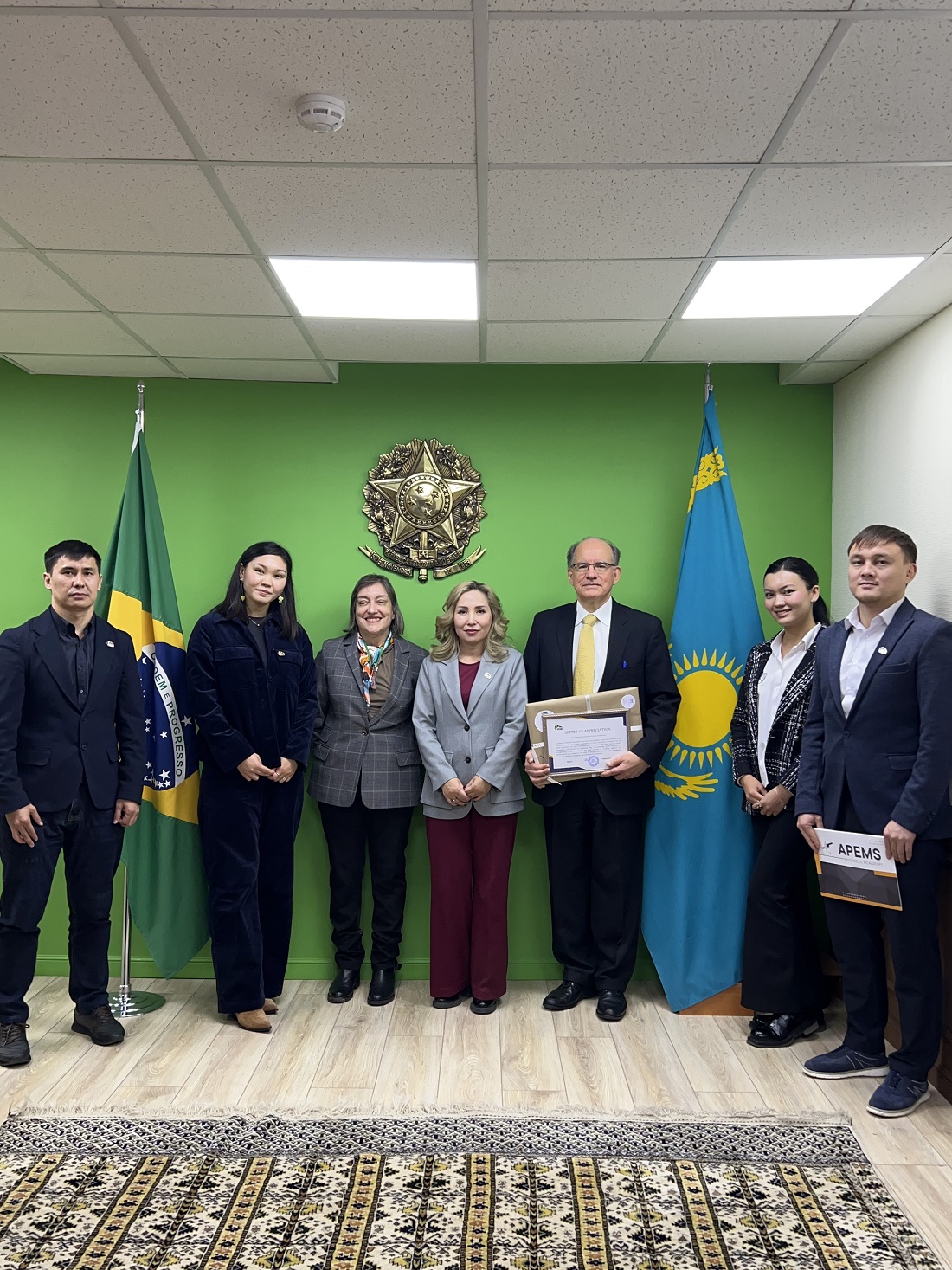 A delegation from the Academy of Physical Education and Mass Sports (APEMS) visited the Embassy of the Federative Republic of Brazil in Kazakhstan and held a productive meeting with Ambassador Marcel Biato and Minister-Counselor Lilian Duarte. The main goal of the meeting was to discuss prospects for formal cooperation aimed at promoting and developing sports education in Kazakhstan.