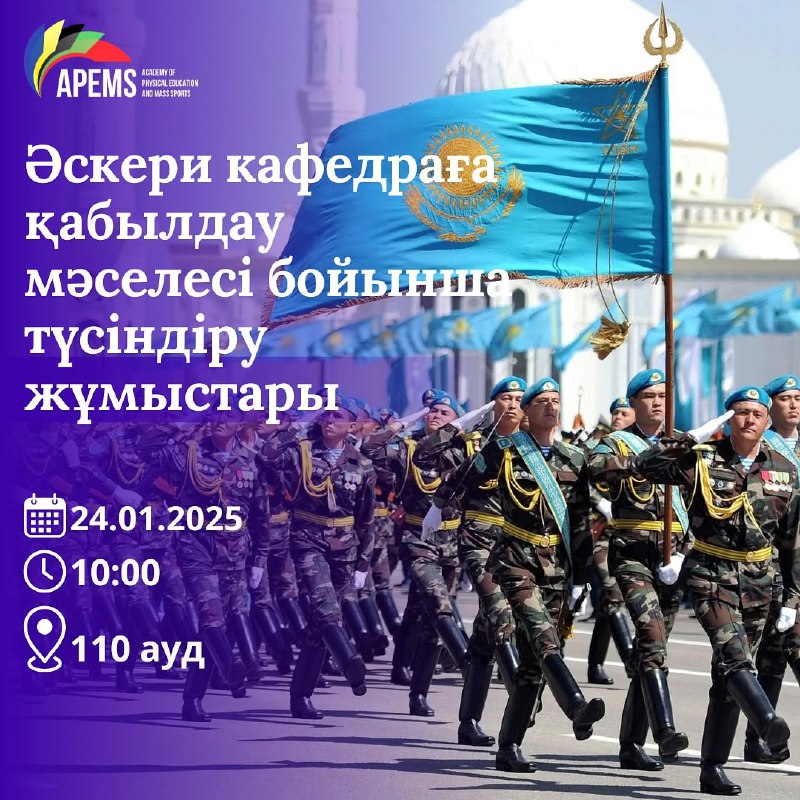 Әскери кафедра өкілдерінің іріктеу конкурсының шарттары туралы студенттерді әскери кафедраға қабылдау мәселесі бойынша түсіндіру жұмыстарын жүргізу мақсатында іс-шара өткізілетінін хабарлаймыз.