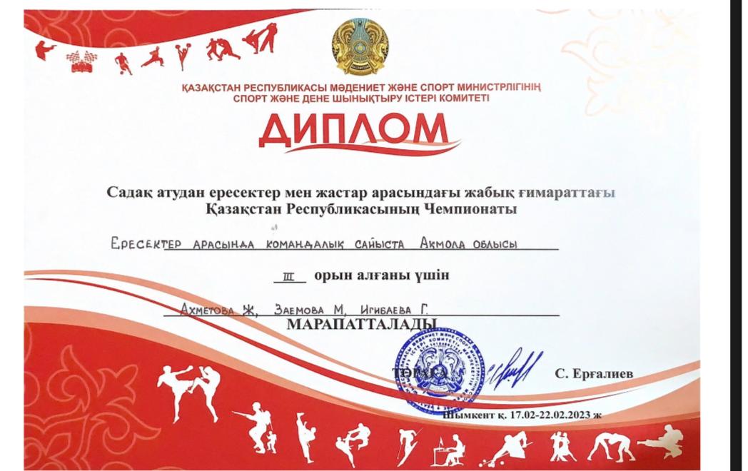 Поздравляем нашу талантливую студентку Ахметову Жанель с бронзовой медалью на чемпионате Казахстана по стрельбе из лука среди женщин, который проходил 15-24.02.2023 в г. Шымкент!